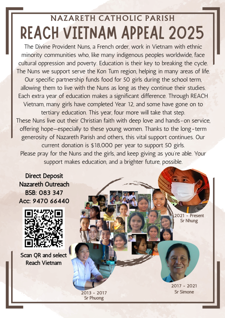 Our REACH Vietnam project will soon enter its fifth year. Reports from some of our folk who recently visited the girls in Kon Tum indicate that the program is going very well. Sr Simone who replaced Sr Phuong last year is totally committed to the program and the girls. Our contribution feeds fifty girls, plus now also funds extra curricular tutoring in English and Maths which has markedly improved the girls’ school results. As well, the girls are all growing emotionally. One indicator of the success is that this year five girls will move on to tertiary education and next year potentially seven will do so. However, we have become aware that some girls are precluded from either finishing high school as their families are unable to meet the financial requirements that grow towards the end of high school and likewise, some girls cannot move on to tertiary education. Some of these costs have been covered, but the decision has been made that we, as a parish, shall try to increase our contribution to cover these additional costs. Putting this into perspective, the amounts are quite small by Australian standards, totalling perhaps a couple of thousand dollars per year, on top of our current contribution of around $16,000. Given our plan to continue this project foreseeably, we are enabling, via education, parts of an ethnic minority community to move out of the cycle of poverty over a generation or so. We are using our gifts for the good of others, and at the same time gaining an understanding of their culture, thus enriching our own lives – isn’t this the gospel message in action?